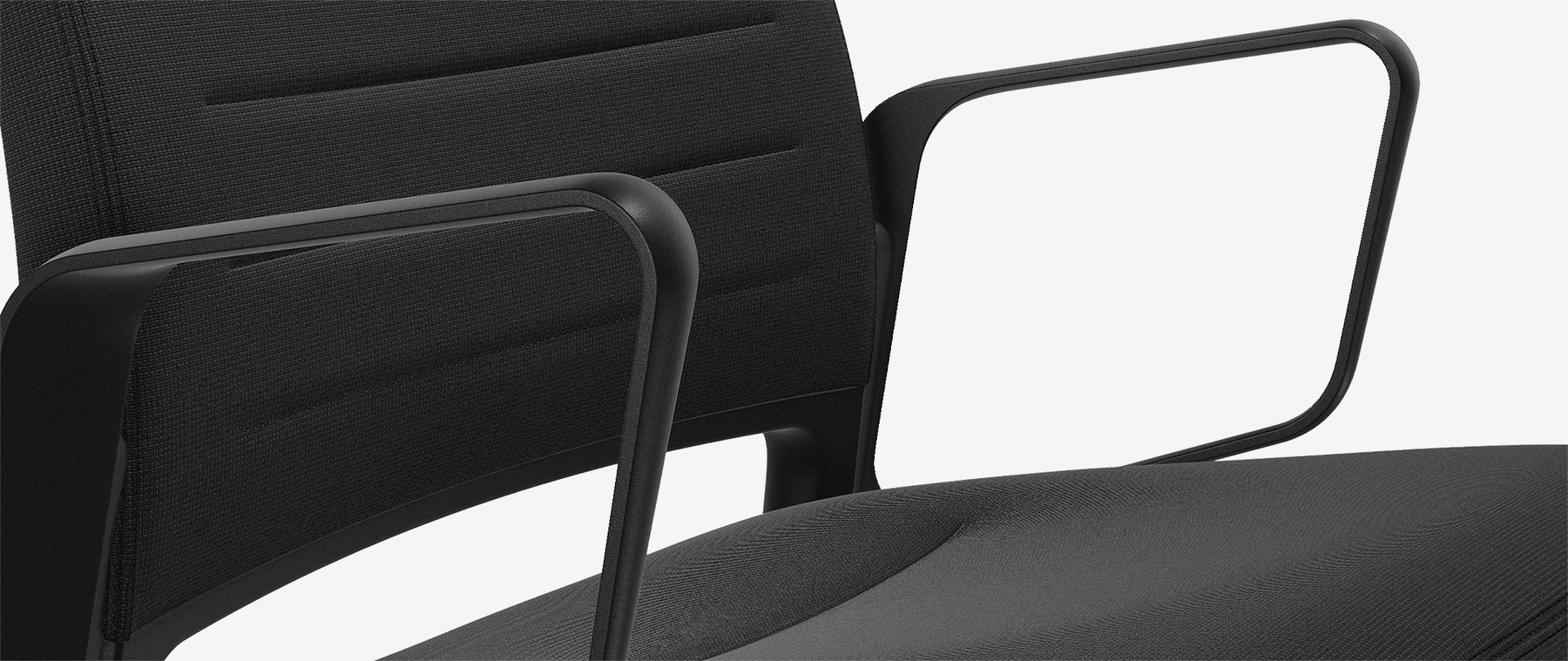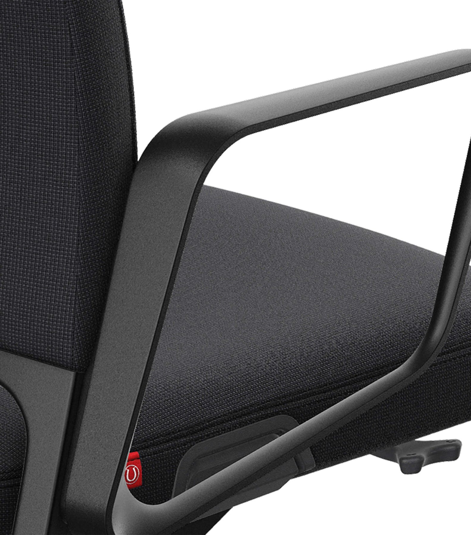 Welches Material wird verwendet und wie ist die Farbgestaltung? Der Stuhl gibt es in einer Stoff-Edition (z. B. Stoffbezug „KING L ELAST“ in graphitschwarz) sowie mit Lederoptionen. Die Armlehnen (Ringarm), Fußkreuz und Mittelsäule sind ebenfalls in schlichtem Schwarz bzw. graphitschwarz gehalten – Aluminium beschichtet.